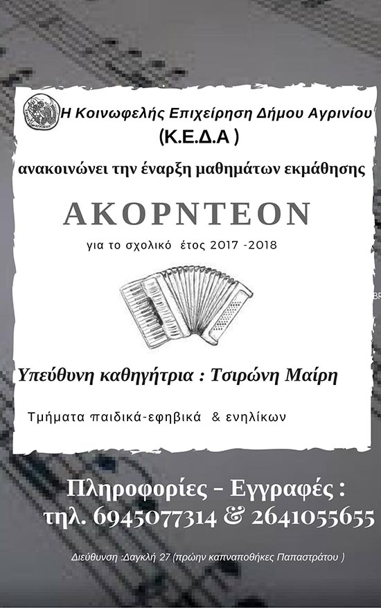 Η Κοινωφελής Επιχείρηση Δήμου Αγρινίου ανακοίνωσε την έναρξη μαθημάτων εκμάθησης ακορντεόν για το σχολικό έτος 2017 -2018 από την Κυριακή 1η Οκτωβρίου.