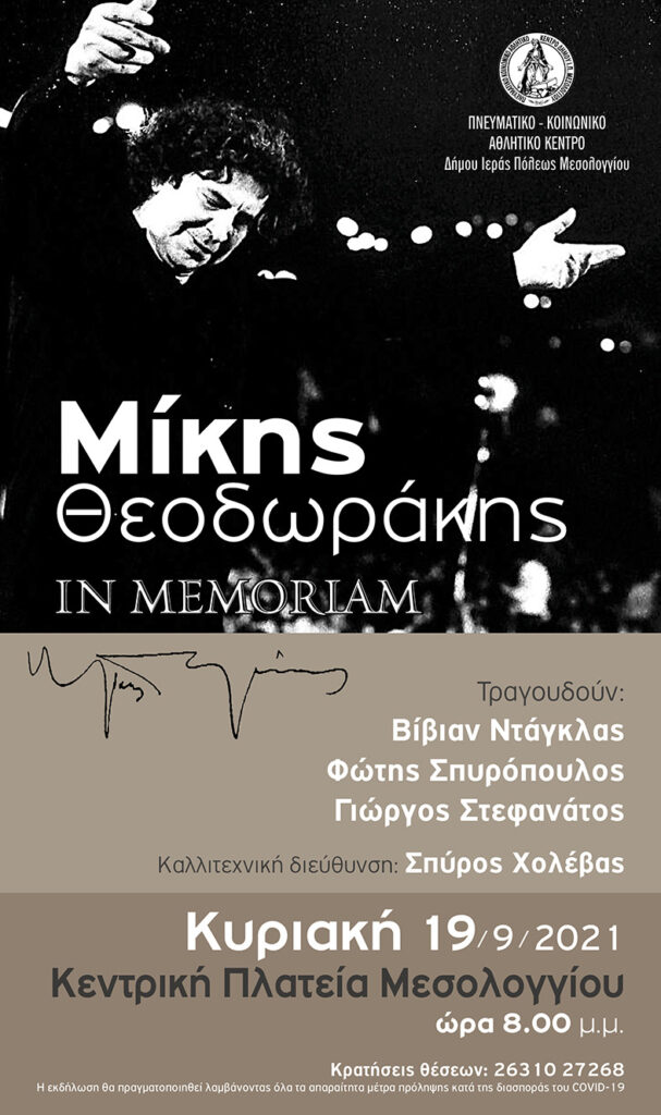 Τα τραγούδια του Μίκη Θεοδωράκη θα «πλημμυρίσουν» το κέντρο του Μεσολογγίου την Κυριακή 19 Σεπτεμβρίου 2021 στις 8 το βράδυ στο μεγάλο αφιέρωμα της πόλης στον αξεπέραστο συνθέτη και παγκόσμιο καλλιτέχνη!