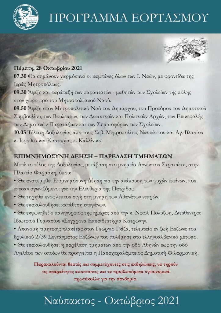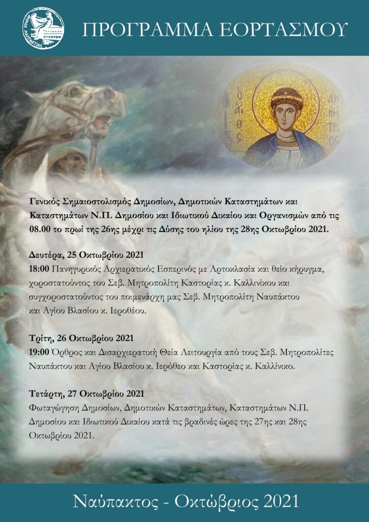 Ο Δήμαρχος Ναυπακτίας κ. Βασίλειος Γκίζας και το Δημοτικό Συμβούλιο σας προσκαλούν στις εκδηλώσεις για τον εορτασμό του Πολιούχου μας Αγίου Δημητρίου και της Εθνικής Επετείου της 28ης Οκτωβρίου 1940.