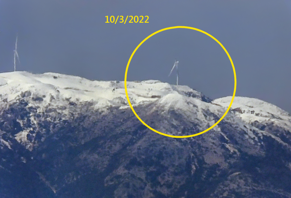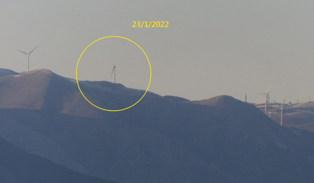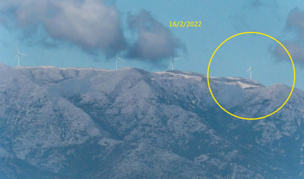 Ο «υπερσύγχρονος» αιολικός σταθμός που εγκαταστάθηκε στα όρη Ακαρνανικά το έτος 2018 και κόστισε συνολικά 41εκατ.€, είναι πλέον υπό διάλυση και υπολειτουργεί εδώ και τουλάχιστον 2 (δύο) μήνες, καθώς από το δεύτερο μισό του μηνός Ιανουαρίου 2022 έως σήμερα, παρατηρείται πως η μια εκ των 11 (έντεκα) ανεμογεννητριών υπέκυψε στις ακραίες καιρικές συνθήκες που επικρατούσαν στο βουνό κατά την διάρκεια του χειμώνα, με αποτέλεσμα να καταρρεύσει ένα από τα πτερύγιά της. Το συμβάν είναι ορατό ακόμα και από την περιοχή του Αγρινίου (βλ. σχετικές φωτογραφίες).