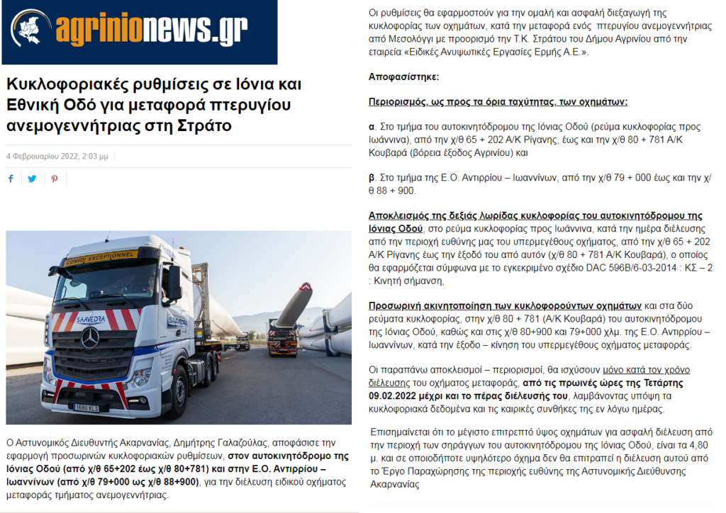Η εταιρία που έχει στην ιδιοκτησία της τον εν λόγω αιολικό σταθμό, έχει δρομολογήσει ήδη τις πρώτες διαδικασίες για την αντικατάσταση του πτερυγίου, καθώς στις 9/2/2022 εφαρμόστηκαν κυκλοφοριακές ρυθμίσεις για την μεταφορά αυτού, από το λιμάνι του Μεσολλογίου έως τον χώρο προσωρινής εναπόθεσής του στην Τ.Κ. Στράτου (βλ. σχετική εικόνα).