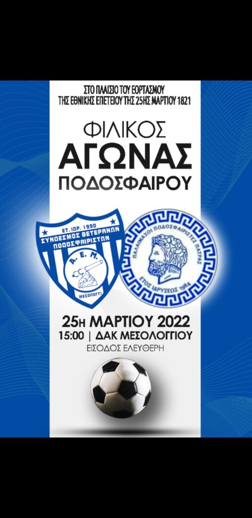 Την Παρασκευή 25 Μαρτίου 2022 και ώρα 3.00 μμ στο Δημοτικό Στάδιο Μεσολογγίου στο πλαίσιο του εορτασμού της Εθνικής Επετείου της κήρυξης της Επανάστασης του 1821, θα διεξαχθεί φιλικός αγώνας μεταξύ των ομάδων παλαιμάχων του Μεσολογγίου και των Πατρών.