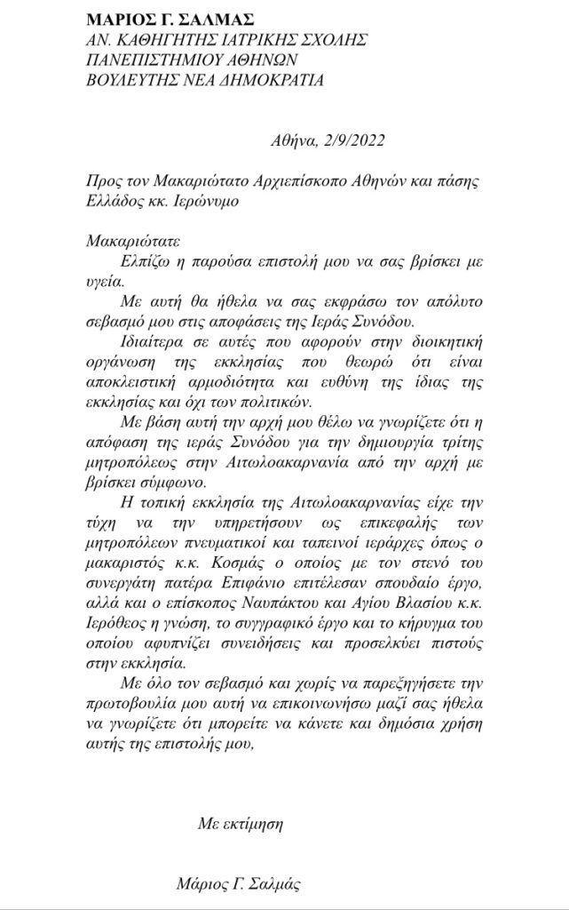 «Γραμμή» υπέρ της διαίρεσης της Μητρόπολης Αιτωλίας και Ακαρνανίας δίνουν οι βουλευτές της Νέας Δημοκρατίας Μάριος Σαλμάς και Σπήλιος Λιβανός οι οποίοι παρά το «άδειασμά» τους λόγω της επικείμενης εκλογής Μητροπολίτου Αιτωλίας και Ακαρνανίας που ουσιαστικά ματαιώνει κάθε σχέδιο απόσχισης, οι δυο βουλευτές συνεχίζουν παρασκηνιακά τις απέλπιδες παρασκηνιακές προσπάθειές τους, με το πρόσχημα ότι σέβονται τις αποφάσεις της ηγεσίας της Εκκλησίας.