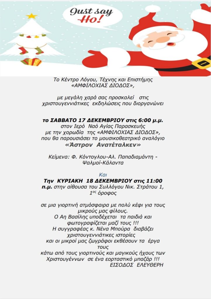 Ενδιαφέρουσες και διασκεδαστικές χριστουγεννιάτικες εκδηλώσεις διοργανώνει το Κέντρο Λόγου, Τέχνης και Επιστήμης “Αμφιλοχίας Δίοδος” το Σαββατοκύριακο (17 και 18 Δεκεμβρίου).