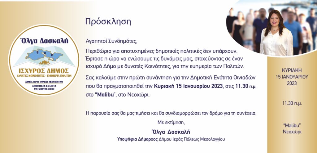 Σας καλούμε στην πρώτη συνάντηση για την Δημοτική Ενότητα Οινιαδών που θα πραγματοποιηθεί την Κυριακή 15 Ιανουαρίου 2023 στις 11.30 π.μ. στο χώρο του καφέ “Malibu”, στο Νεοχώρι.