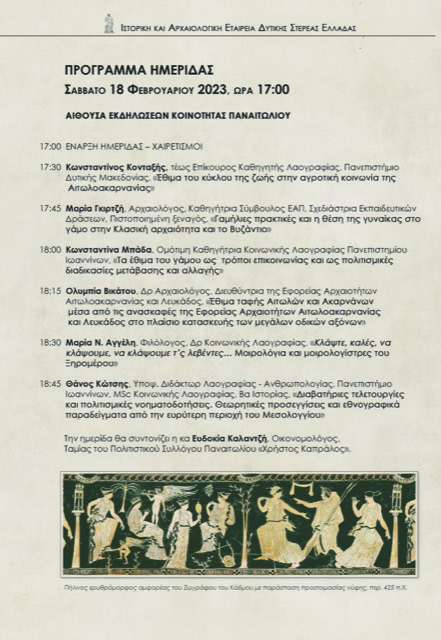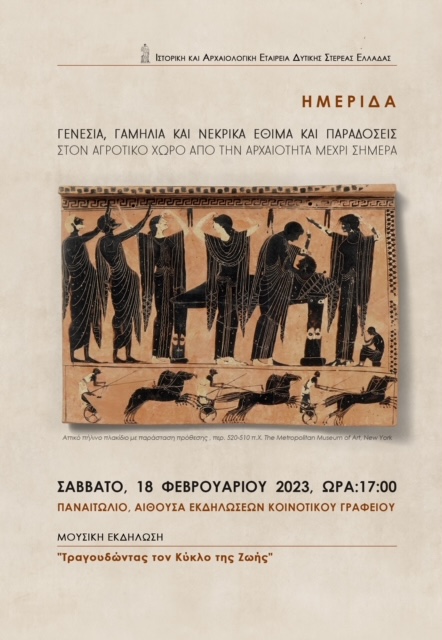 Αγαπητά μέλη, αγαπητοί φίλοι της Ιστορικής και Αρχαιολογικής Εταιρείας Δυτικής Στερεάς Ελλάδας με έδρα το Αγρίνιο, είμαστε στην ευχάριστη θέση να σας προσκαλέσουμε στην τρίτη κατά σειρά θεματική ημερίδα της Εταιρείας μας στο πλαίσιο του Προγράμματος Leader της ΤΡΙΧΩΝΙΔΑ Α.Ε. με το ειδικό θέμα: “Γενέσια, γαμήλια και νεκρικά έθιμα και παραδόσεις στον αγροτικό χώρο από την αρχαιότητα μέχρι σήμερα”, η οποία θα πραγματοποιηθεί το Σάββατο 18 Φεβρουαρίου 2023 και ώρα 17:00 στο Παναιτώλιο στην αίθουσα εκδηλώσεων της Τοπικής Κοινότητας, σε συνδιοργάνωση με τον Πολιτιστικό Σύλλογο Παναιτωλίου “Χρήστος Καπράλος”.