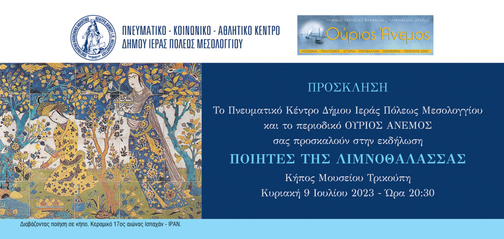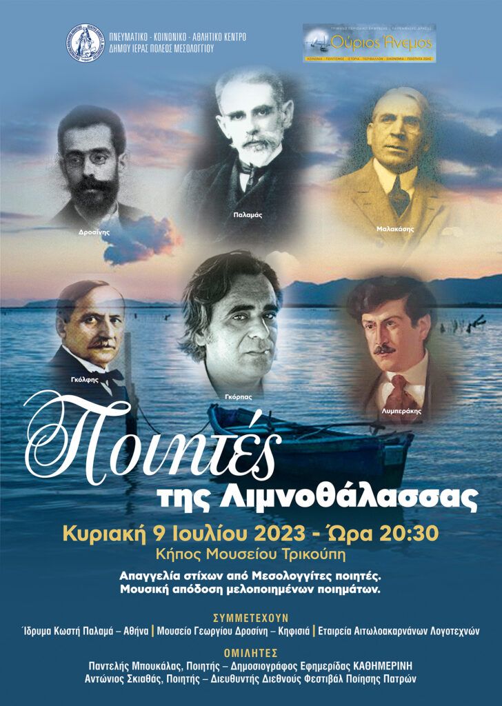 Την Κυριακή 9 Ιουλίου 2023 και  ώρα 20:30 στον Κήπο Μουσείου Σπυρίδωνος και Χαριλάου Τρικούπη μέσα στην καλοκαιρινή νυχτιά θα λάβει χώρα μια μαγική εκδήλωση με Απαγγελία στίχων Μεσολογγιτών Ποιητών, Μουσική απόδοση μελοποιημένων ποιημάτων και έκθεση ποιητικών συλλογών με τίτλο «Ποιητές της Λιμνοθάλασσας».