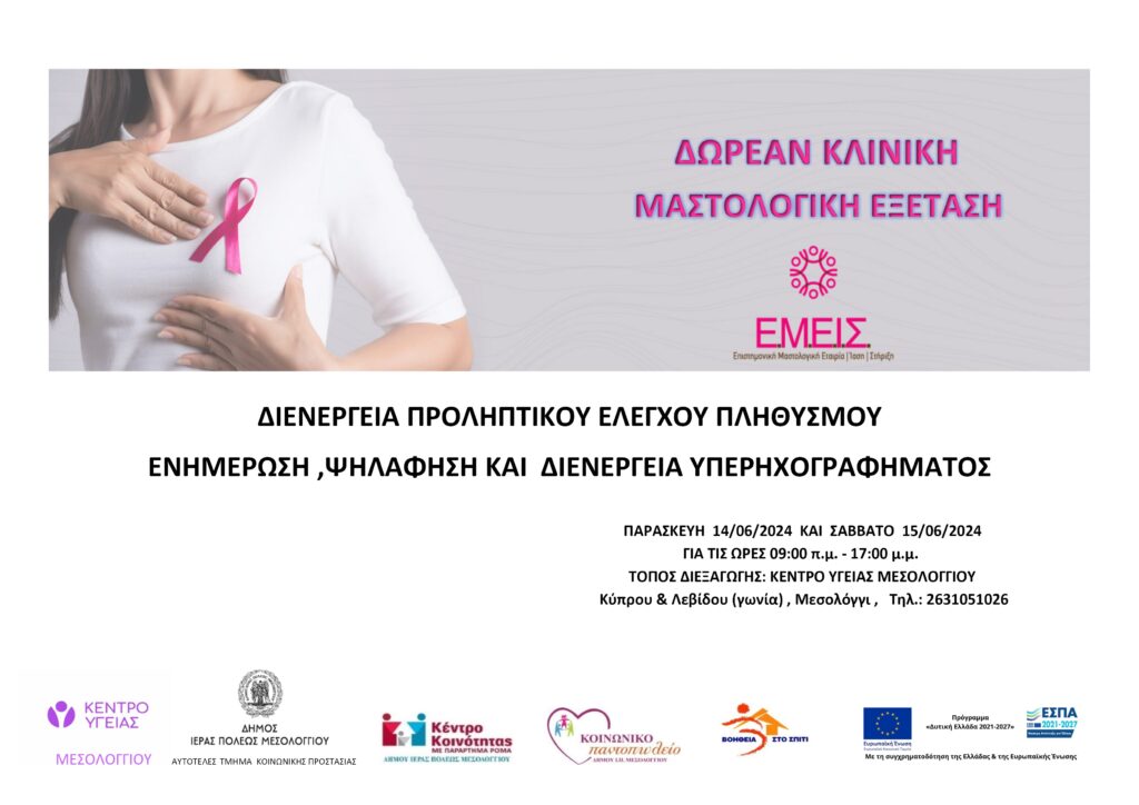 Ο Δήμος Ιερής Πόλης Μεσολογγίου σε συνεργασία με το Κέντρο Υγείας Μεσολογγίου και με την ευγενική χορηγία της Επιστημονικής Μαστολογικής Εταιρία, Ίαση, Στήριξη «EMEIΣ», πραγματοποιεί στο Κέντρο Υγείας Μεσολογγίου (Κύπρου & Λεβίδου) δωρεάν μαστολογική εξέταση σήμερα Παρασκευή 14 Ιουνίου και αύριο Σάββατο 15 Ιουνίου 2024,από τις 09:00 έως τις 17:00.
