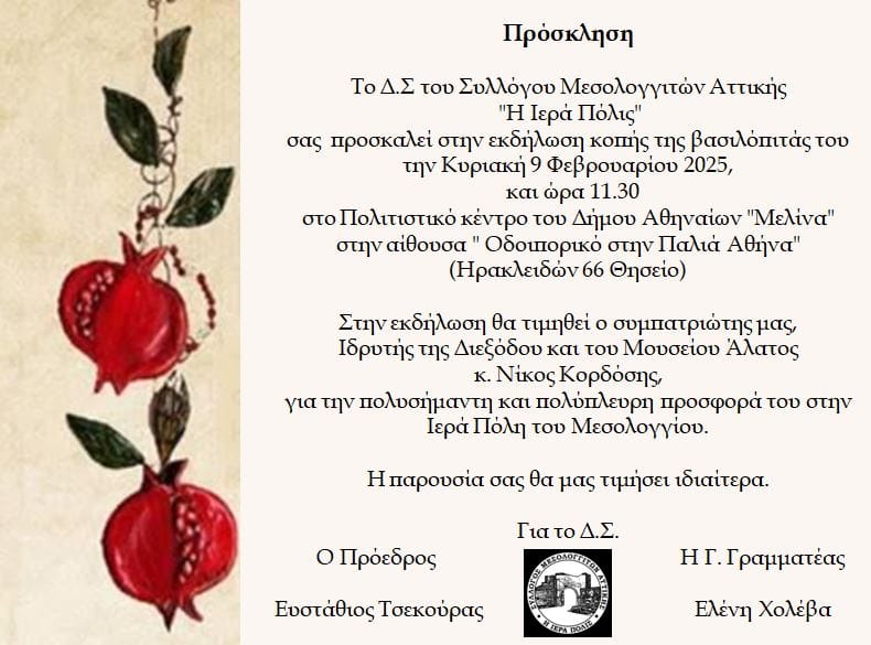 Ένα χρόνο μετά την ίδρυση του ιδιαίτερα δραστήριου Συλλόγου Μεσολογγιτών Αττικής «Η Ιερά Πόλις», θα πραγματοποιηθεί η κοπή της πρωτοχρονιάτικης πίτας με βράβευση, μικρό απολογισμό της πρώτης χρονιάς και προγραμματισμό δράσεων με φόντο το 2026!