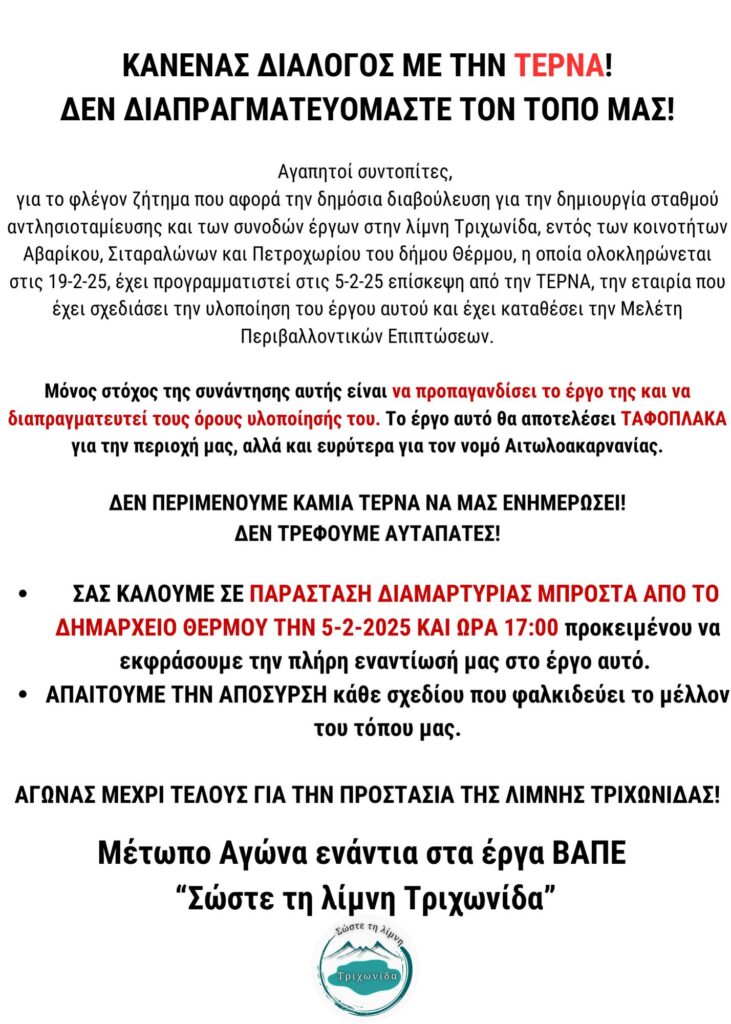 Ενεργοί πολίτες και φορείς καλούν σε μαζική παράσταση διαμαρτυρίας μπροστά από το Δημαρχείο Θέρμου, ενόσω εκπρόσωποι της ΤΕΡΝΑ θα πραγματοποιούν επίσκεψη- ενημέρωση – Απαιτούν την απόσυρση του σχεδίου που φαλκιδεύει το μέλλον του τόπου μας.