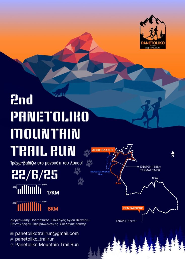 Μετά την 1η επιτυχημένη διοργάνωση τον Ιούλιο του 2024, οι Πολιτιστικοί Σύλλογοι Αγίου Βλασίου, Πεντακόρφου και ο Περιβαλλοντικός Σύλλογος Χούνης, σχεδιάζουμε το επόμενο βήμα του Panetoliko Mountain Trail Run! Ο πρώτος αγώνας ορεινού τρεξίματος που διεξήχθη στο Δήμο Αγρινίου, συνεχίζεται τον Ιούνιο του 2025.