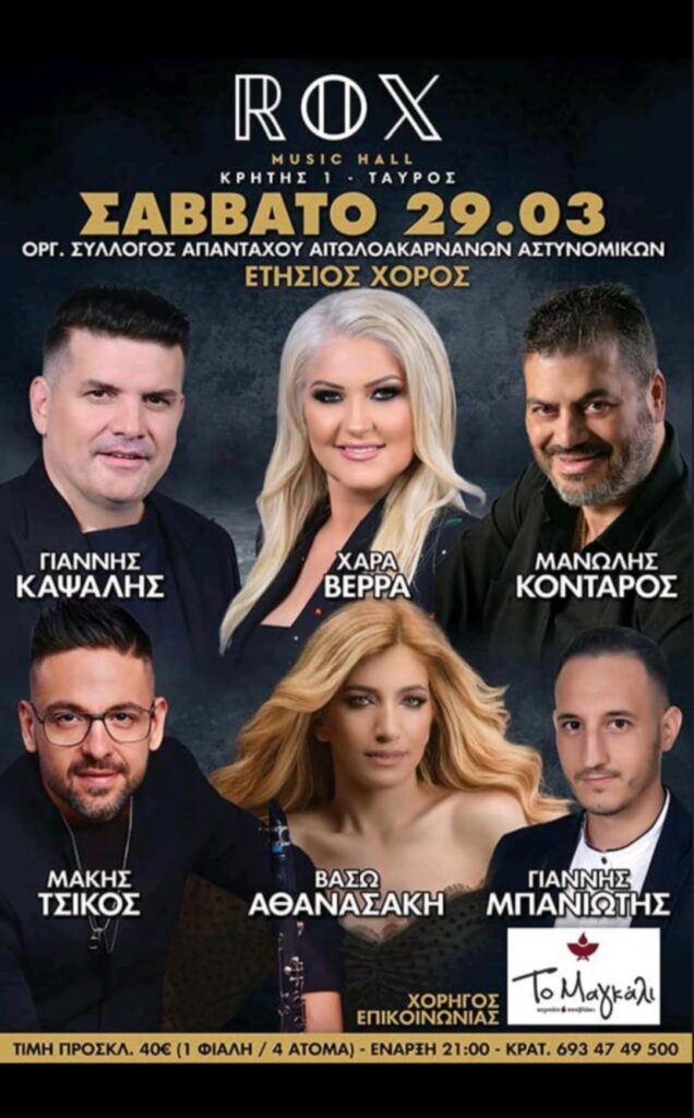 Αυτή τη φορά, οι Αιτωλοακαρνάνες Αστυνομικοί της Αττικής και όχι μόνο, δίνουν ραντεβού στο κορυφαίο κέντρο διασκέδασης ROX Music Hall (Κρήτης 1, Ταύρος), το Σάββατο 29 Μαρτίου 2025 με ώρα έναρξης στις 9μμ.