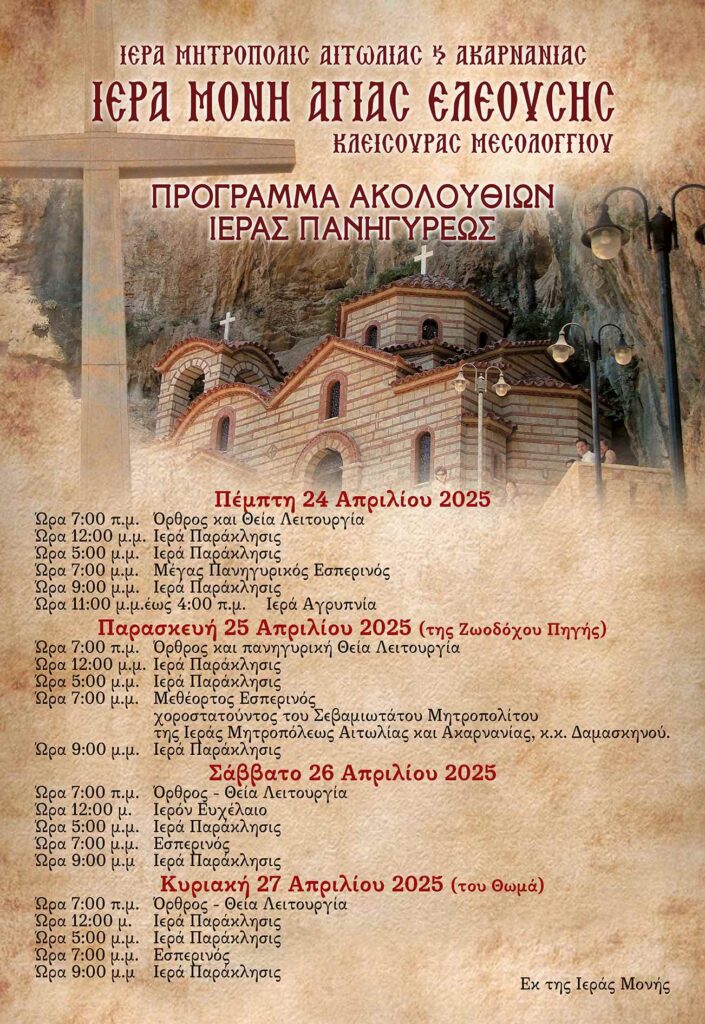 Από την Ιερά Μονή Αγίας Ελεούσης Κλεισούρας Μεσολογγίου ανακοινώνεται ότι, το πρόγραμμα των Ακολουθιών της Ιεράς Πανηγύρεως από την Πέμπτη Διακαινησίμου εβδομάδος 24/4, μέχρι και την Κυριακή του Θωμά 27/4, έχει όπως παρακάτω: