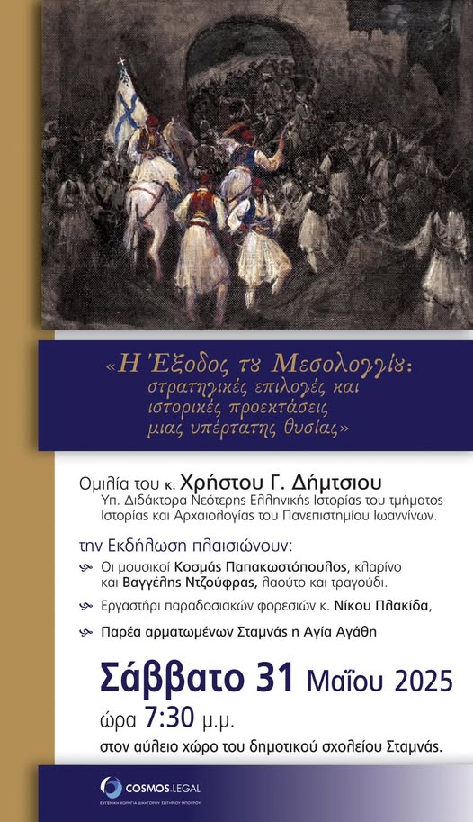 Στην εκδήλωση, βασικός ομιλητής είναι ο Χρήστος Γ. Δήμτσιος, υποψήφιος Διδάκτορας Νεότερης Ελληνικής Ιστορίας του τμήματος Ιστορίας και Αρχαιολογίας του Πανεπιστημίου Ιωαννίνων και θα μιλήσει για τις στρατηγικές επιλογές και ιστορικές προεκτάσεις της υπέρτατης θυσίας της εξόδου των Μεσολογγιτών.