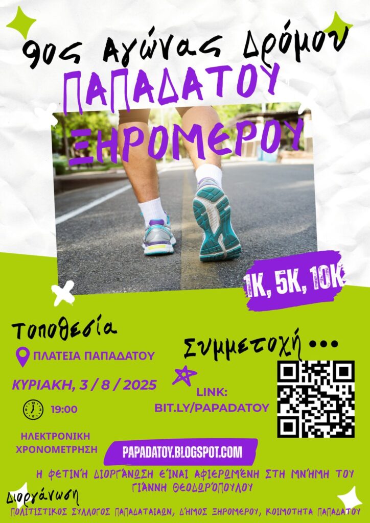 Με χαρά σας προσκαλούμε στον 9ο Αγώνα Δρόμου Παπαδάτου Ξηρομέρου, έναν θεσμό που ενώνει αθλητές, εθελοντές και φίλους της περιοχής μας.