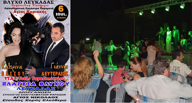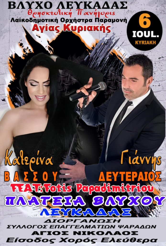 Η εκθαμβωτική Κατερίνα Βάσσου και ο μοναδικός Γιάννης Δευτεραίος υπόσχονται να ξεσηκώσουν όσους βρεθούν στον Βλυχό Λευκάδας, εκεί όπου «χτυπά»η καρδιά του λευκαδίτικου πανηγυριού. Με τιμές λαϊκές και λογικές σε άφθονες παγωμένες μπύρες, χειροποίητα σουβλάκια και με ατελείωτο κέφι μέχρι το πρωί!