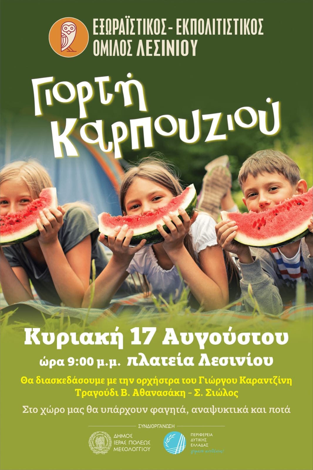 Ο Εξωραϊστικός Εκπολιτιστικός Όμιλος Λεσινίου τιμώντας το τοπικό προϊόν και συνεχίζοντας την παράδοση που έχει θεσπίσει τα τελευταία χρόνια, διοργανώνει για άλλη μια χρονιά την Γιορτή καρπουζιού την Κυριακή 17 Αυγούστου και ώρα 21:00 μ.μ. στην Κεντρική Πλατεία Λεσινίου.