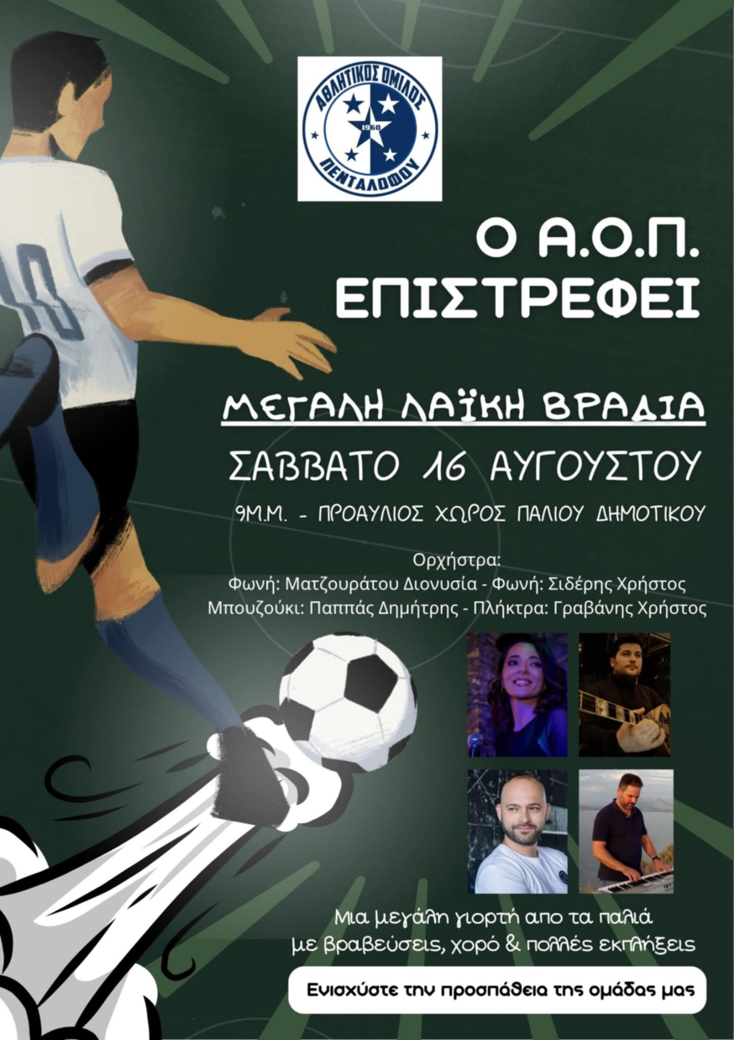 Η επιστροφή του Α.Ο.Π. ξεκινά με μια λαϊκή βραδιά το Σάββατο 16 Αυγούστου 2025 και ώρα 9μ.μ. στον προαύλιο χώρο του παλιού δημοτικού.