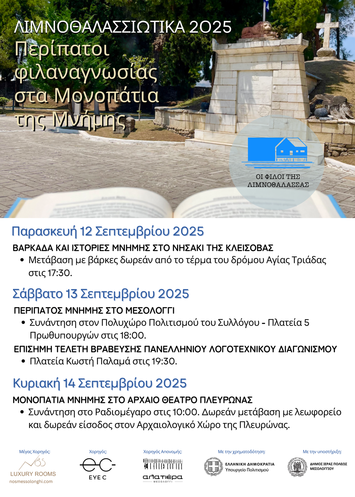 Το Μεσολόγγι φοράει τα γιορτινά του και υποδέχεται ξανά και φέτος τα «Λιμνοθαλασσιώτικα 2025»! Για δεύτερη συνεχόμενη χρονιά το πρόγραμμα των εκδηλώσεων αποτελείται από ένα τριήμερο φιλαναγνωσίας αφιερωμένο στη μνήμη, από την Παρασκευή 12 έως και την Κυριακή 14 Σεπτεμβρίου 2025, ενώ το Σάββατο 13 Σεπτεμβρίου θα τιμηθούν οι νικητές του 2ου Ετήσιου Πανελλήνιου Λογοτεχνικού Διαγωνισμού, που διενεργήθηκε κατά την περίοδο του καλοκαιριού! Αξίζει να σημειωθεί πως οι εκδηλώσεις εντάσσονται στο πρόγραμμα Δημιουργική Ελλάδα του Υπουργείου Πολιτισμού.