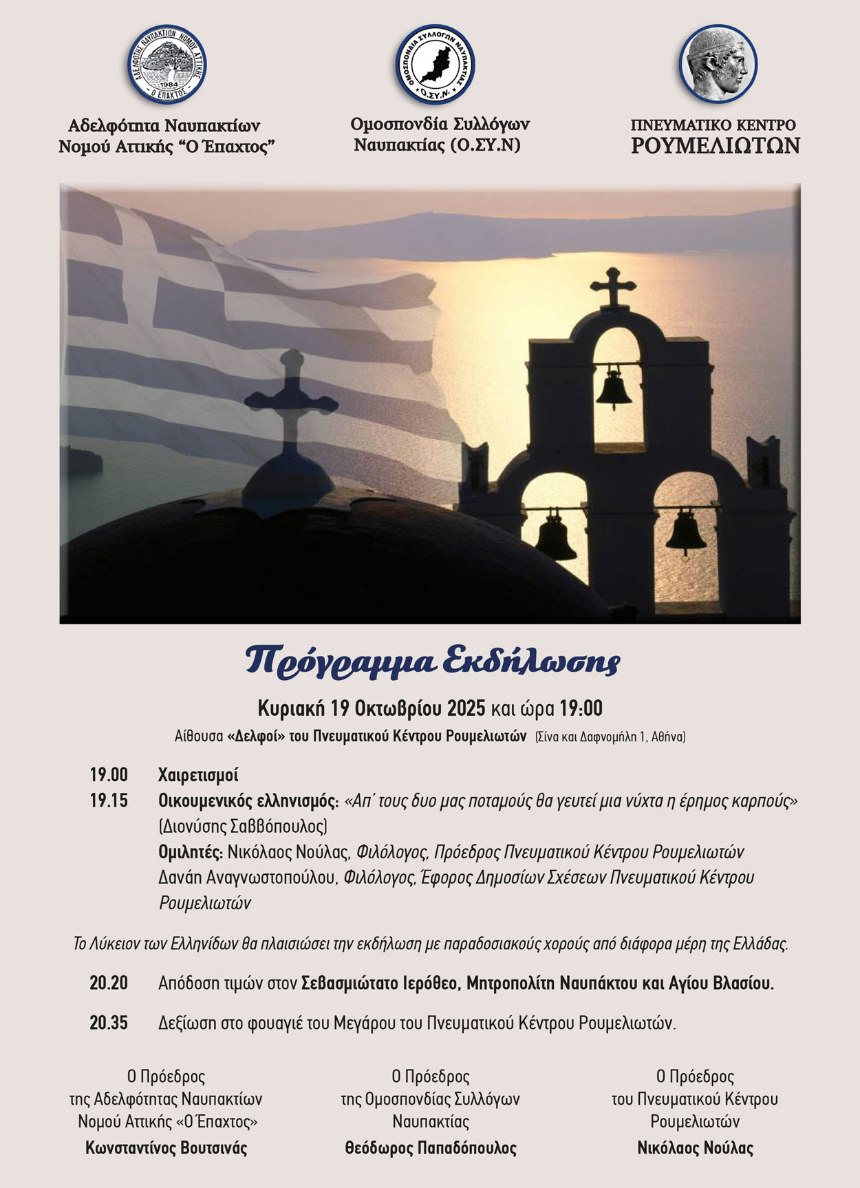 Το Πνευματικό Κέντρο Ρουμελιωτών (ΠΚΡ), η Αδελφότητα Ναυπακτίων Νομού Αττικής «Ο Έπαχτος» και η Ομοσπονδία Συλλόγων Ναυπακτίας (Ο.ΣΥ.Ν.) συνδιοργανώνουν εκδήλωση που θα πραγματοποιηθεί την Κυριακή 19 Οκτωβρίου 2025 και ώρα 19:00 στην αίθουσα «Δελφοί» του ΠΚΡ (Σίνα και Δαφνομήλη 1, Αθήνα), με τίτλο: Οικουμενικός ελληνισμός: «Απ’ τους δυο μας ποταμούς θα γευτεί μια νύχτα η έρημος καρπούς» Διονύσης Σαββόπουλος.