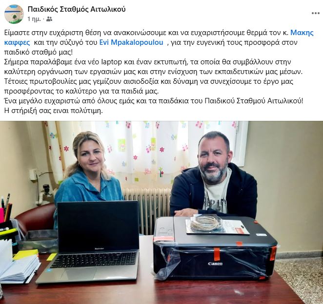 Σε πολύτιμες και αξιόλογες ενέργειες – χορηγίες προχώρησε το τελευταίο διάστημα ο Γεράσιμος Καφφές μαζί με τη σύζυγό του Εύη Μπακαλοπούλου, προσφέροντας με αγάπη εξοπλισμό για την ενίσχυση των εκπαιδευτικών μέσων των σχολικών μονάδων της περιοχής του Μεσολογγίου.