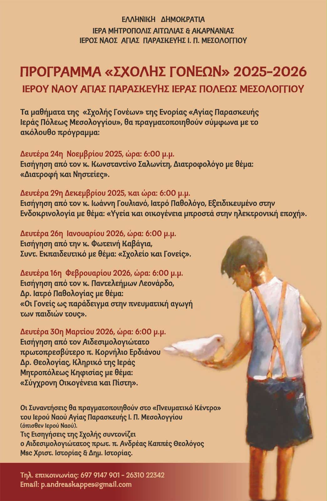 Η Ιερά Μητρόπολη Αιτωλίας και Ακαρνανίας, με σκοπό τη στήριξη του ιερού θεσμού της οικογένειας, θα λειτουργήσει και εφέτος Ενοριακές Σχολές Γονέων στις κεντρικές Ενορίες της Ιεράς Μητροπόλεως.