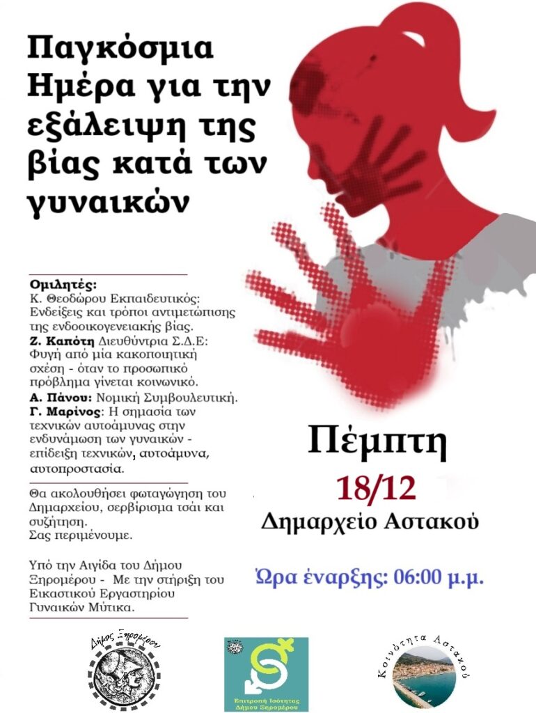 Ο Δήμος Ξηρομέρου, η Επιτροπή Ισότητας του Δήμου Ξηρομέρου και η Τοπική Κοινότητα Αστακού, προσκαλούν την Πέμπτη 18/12 και ώρα 6.00 μ.μ., στην αίθουσα εκδηλώσεων του Δημαρχείου στον Αστακό, σε μια τιμητική εκδήλωση με αφορμή την Παγκόσμια Ημέρα για την εξάλειψη της βίας κατά των γυναικών.
