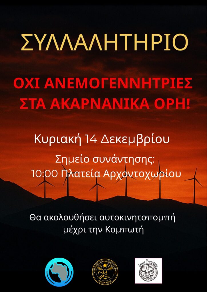 Συλλαλητήριο κατά των ανεμογεννητριών στα Ακαρνανικά Όρη θα πραγματοποιηθεί στο Αρχοντοχώρι Ξηρομέρου την Κυριακή 14 Δεκεμβρίου 2025 και ώρα 10.00 το πρωί.