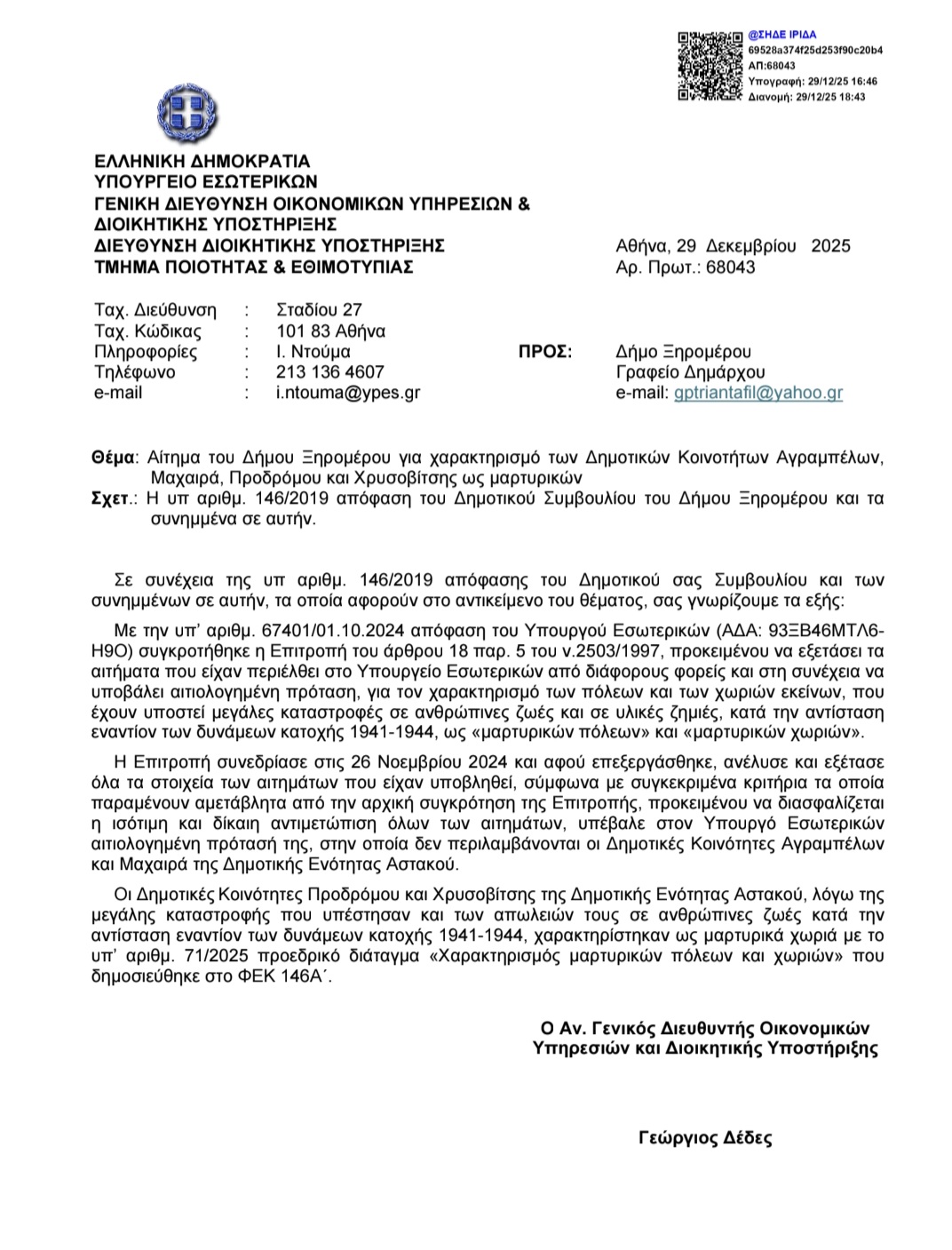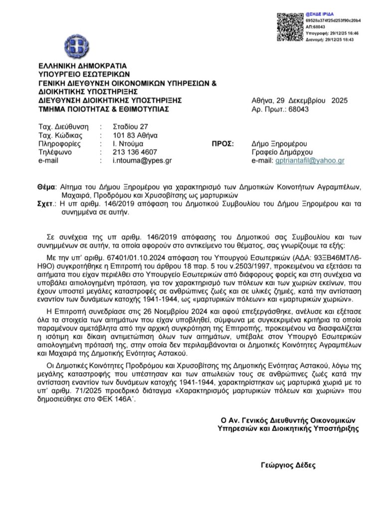 Η αρμόδια Επιτροπή συνεδρίαση και απέρριψε εκ νέου το αίτημα για τις Κοινότητες Μαχαιράς και Αγραμπέλου. Παρακάτω, το σχετικό επίσημο έγγραφο υπ’ αριθμόν πρωτ. 68043/29-12-2025 που απεστάλη στον Δήμο Ξηρομέρου.