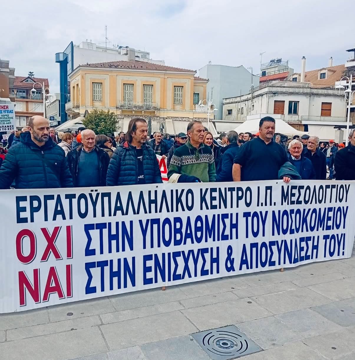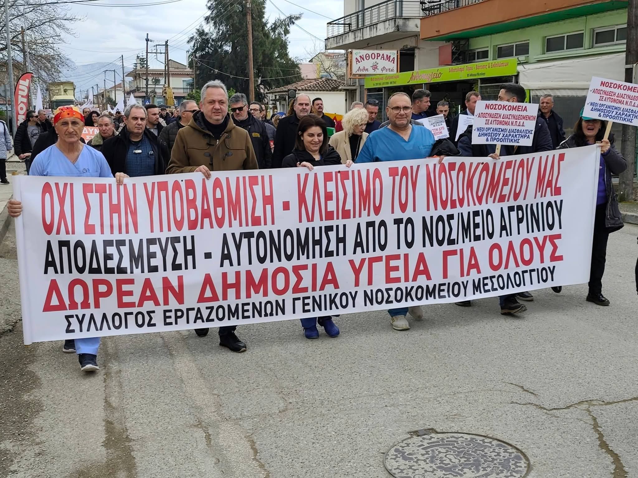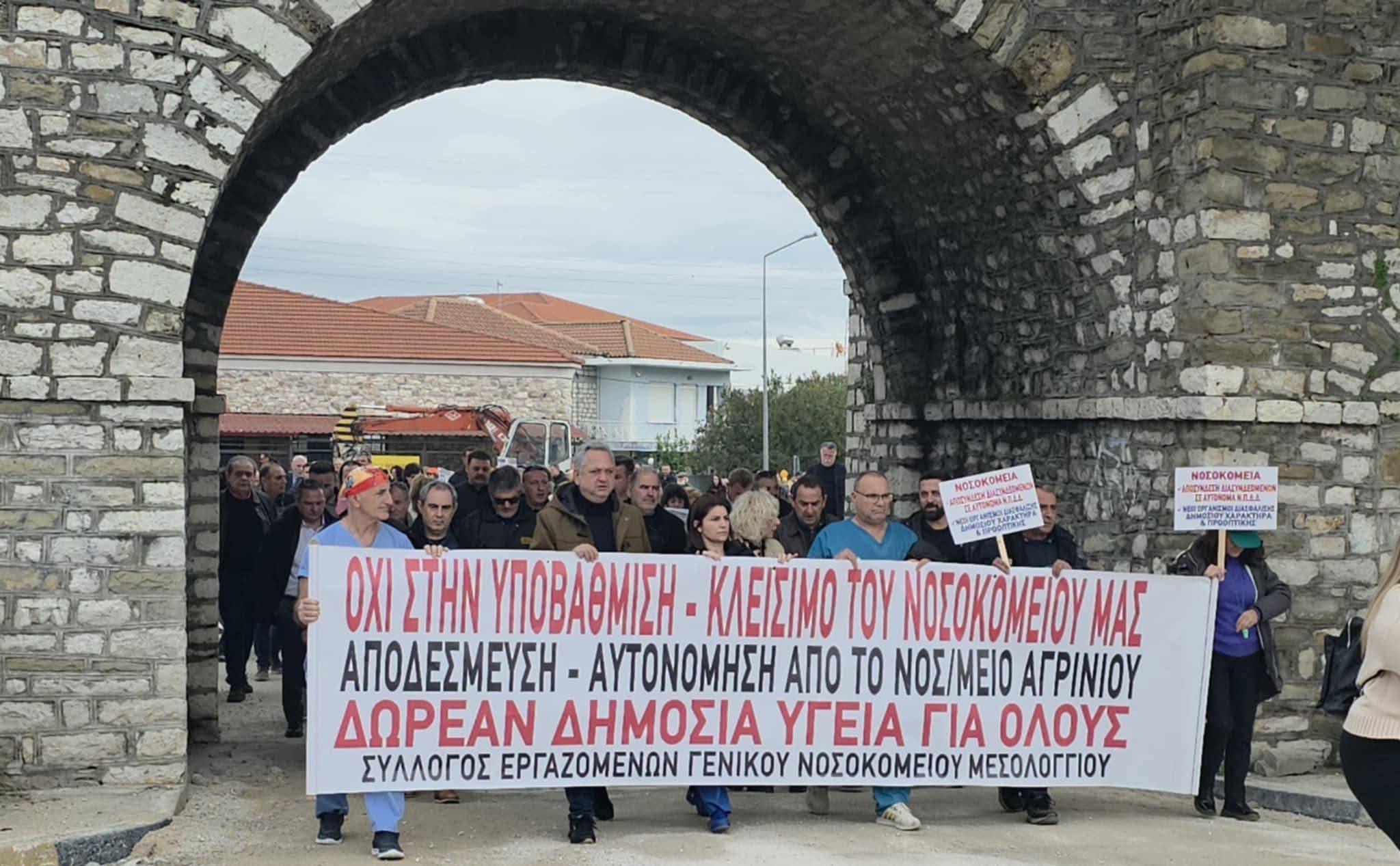 Με μια μαζική κινητοποίηση που διοργανώθηκε από τον Σύλλογο Εργαζομένων του Νοσοκομείου Μεσολογγίου και την ΠΟΕΔΗΝ, αλλά και υποστηρίχθηκε από πολλούς φορείς της περιοχής, εκατοντάδες κόσμου συμμετείχαν στη συγκέντρωση στον αύλειο χώρο του νοσοκομείου, καθώς και στην πορεία προς την κεντρική πλατεία.