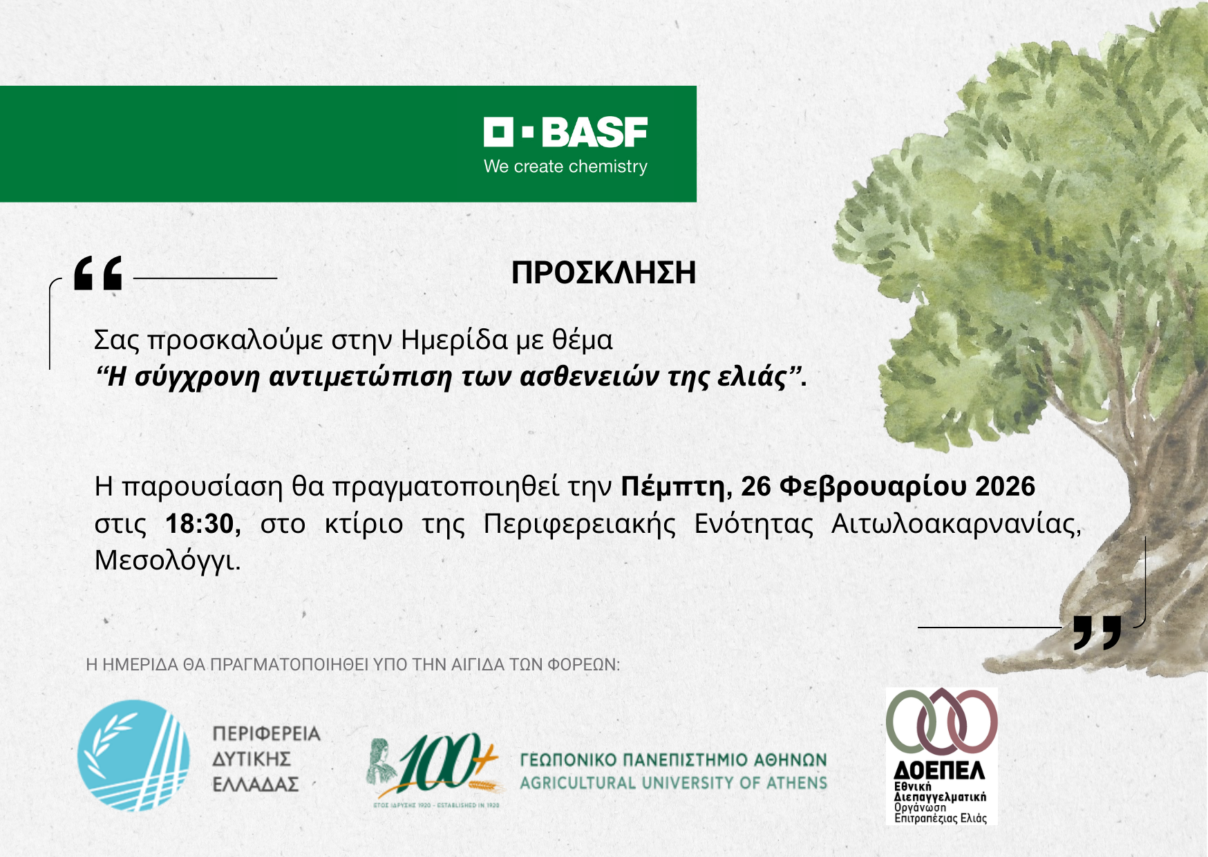Η BASF Ελλάς διοργανώνει ημερίδα με θέμα «Η σύγχρονη αντιμετώπιση των ασθενειών της ελιάς», με στόχο την ενημέρωση και πρακτική υποστήριξη των ελαιοπαραγωγών στις πραγματικές ανάγκες της αγοράς.