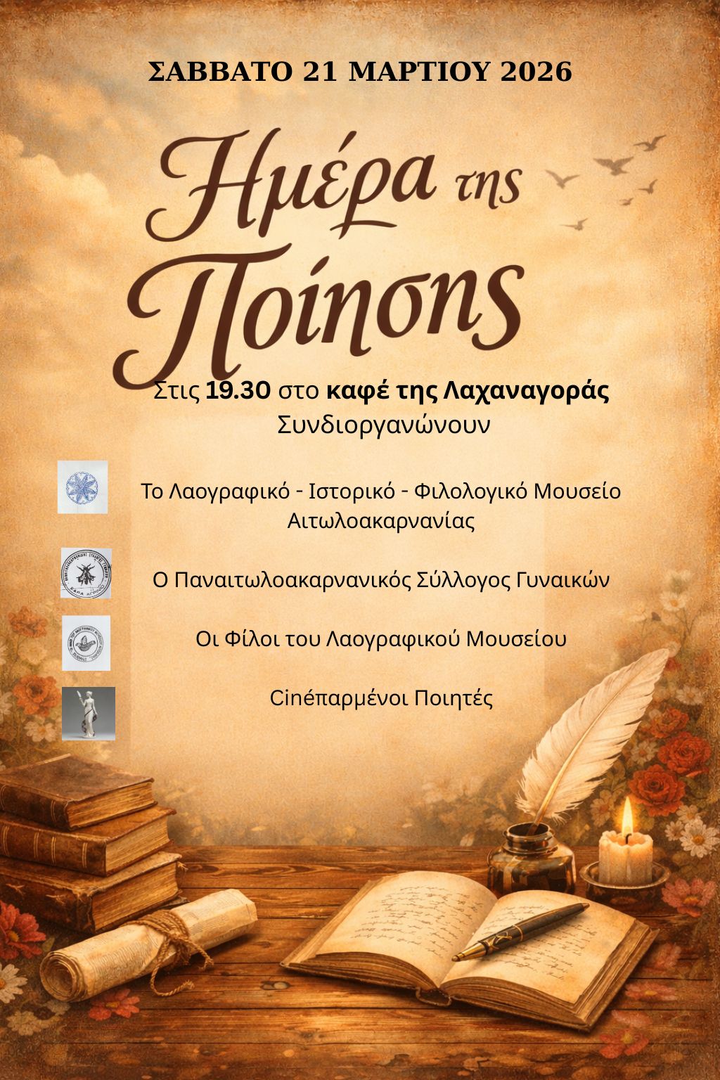 Την εκδήλωση συνδιοργανώνουν το Λαογραφικό – Ιστορικό – Φιλολογικό Μουσείο Αιτωλοακαρνανίας, ο Παναιτωλοακαρνανικός Σύλλογος Γυναικών, οι Φίλοι του Λαογραφικού Μουσείου και ο Μαθητικός Διαγωνισμός «Cinéπαρμένοι Ποιητές».