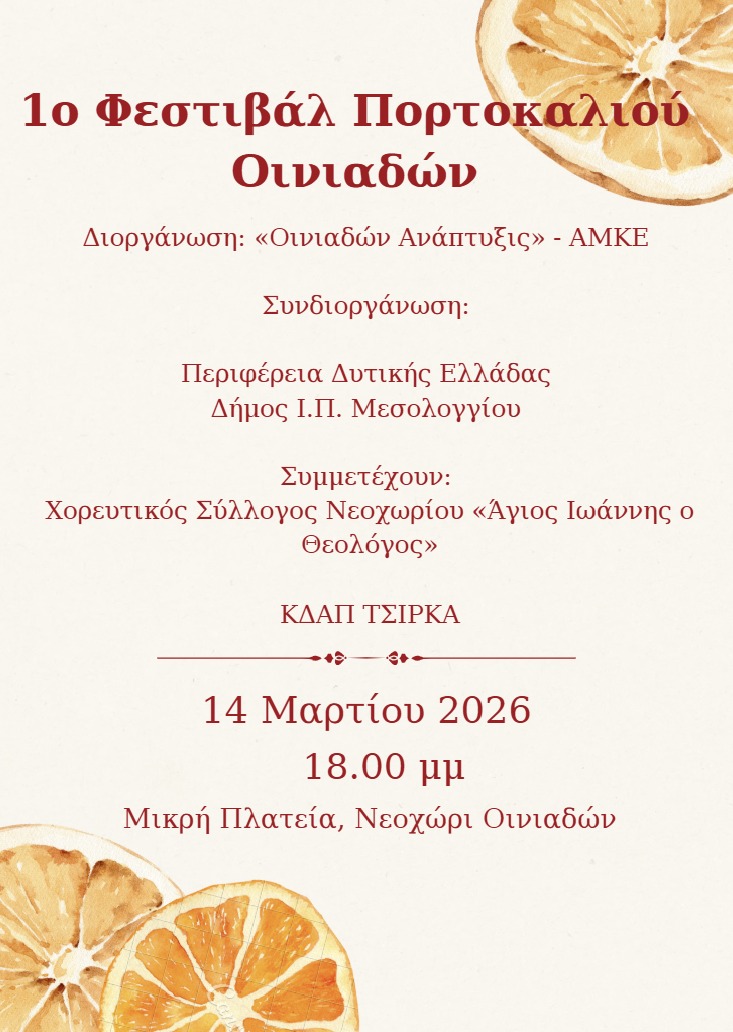 Σήμερα, η προσπάθεια αυτή συνεχίζεται μέσω της πρωτοβουλίας που οραματίστηκε και σχεδίασε η «Οινιαδών Ανάπτυξις» – ΑΜΚΕ, για την ανάδειξη της σημασίας της καλλιέργειας των Εσπεριδοειδών για τον τόπο μας και τη σύνδεση με την τοπική οικονομία, κοινωνία και πολιτισμό, διοργανώνοντας το «1ο Φεστιβάλ Πορτοκαλιού Οινιαδών». Μια εκδήλωση που υποστηρίζει η Περιφέρεια Δυτικής Ελλάδας και ο Δήμος Ι.Π. Μεσολογγίου και αναμένεται να λάβει χώρα το Σάββατο 14 Μαρτίου 2026 και ώρα 6:00 το απόγευμα στη Μικρή Πλατεία στο Νεοχώρι Οινιαδών.