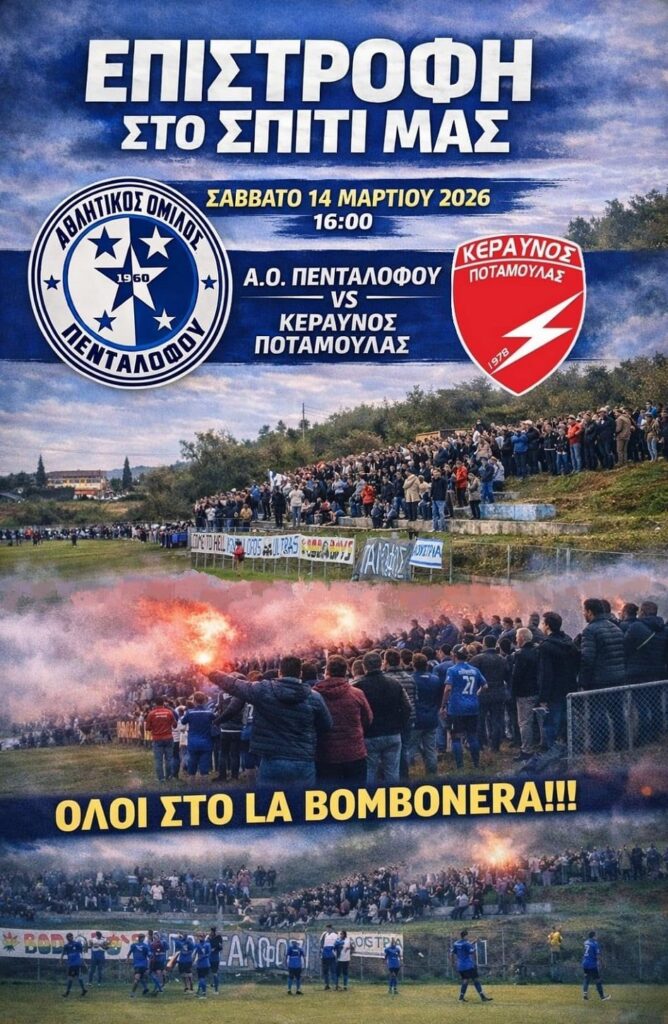 Πλέον, το Σάββατο 14 Μαρτίου και ώρα 4μ.μ. όλοι δρόμοι οδηγούν στο γήπεδο Πενταλόφου, όπου ο ΑΟΠ θα αντιμετωπίσει τον Κεραυνό Ποταμούλας για την τελευταία αγωνιστική της Γ’ κατηγορίας. «Όλοι στο La Bombonera» λένε από την γηπεδούχο ομάδα που ετοιμάζει μια πραγματική γιορτή στο «σπίτι» της που φημίζεται για την ζεστή γηπεδική ατμόσφαιρά του.