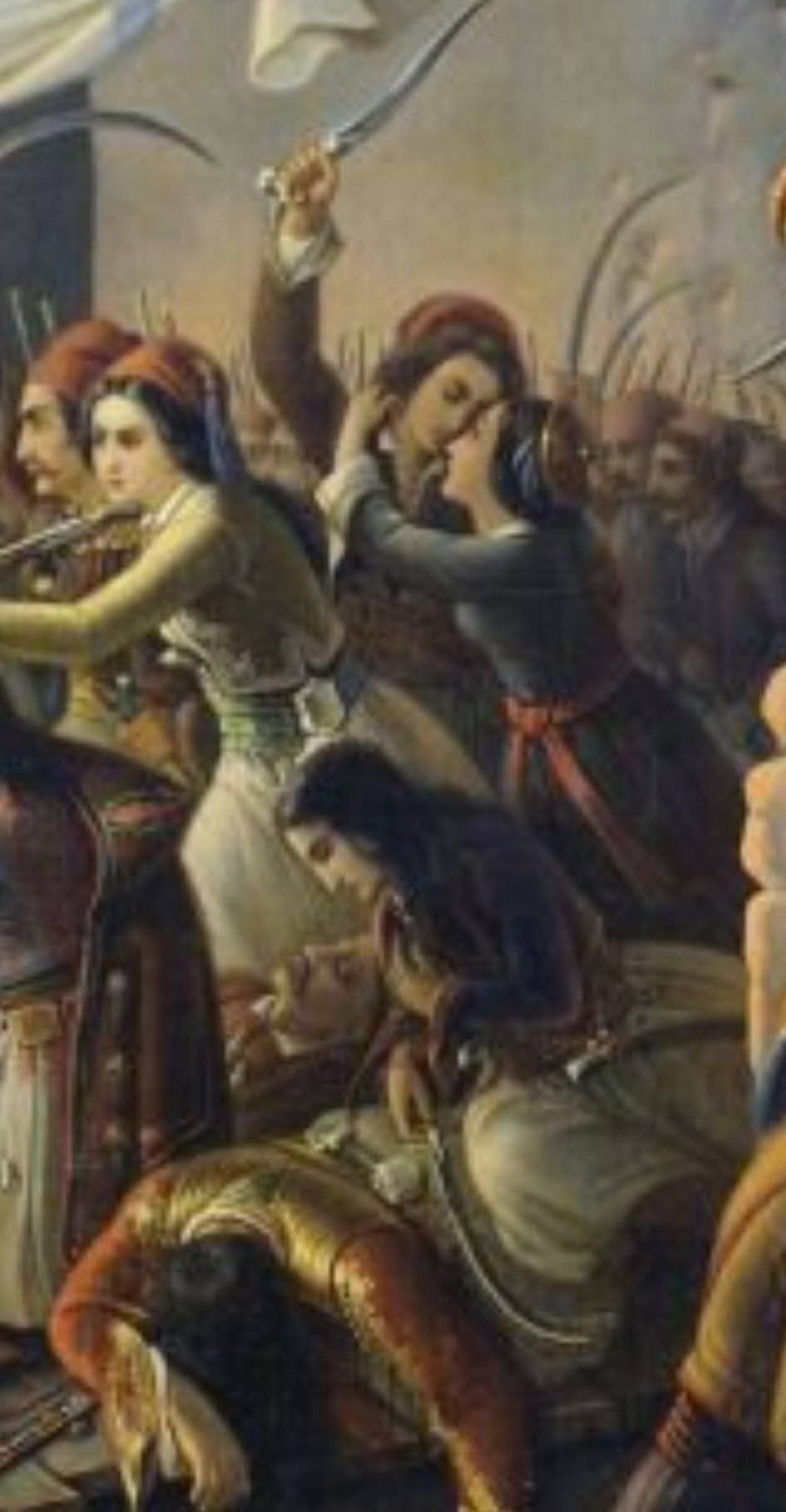 -Στο έργο του καλλιτέχνη που απεικονίζει τη τρίτη φάλαγγα των εξόδουχων” (των οικογενειαρχών) που φυσιολογικά ήταν η πλέον δυσκίνητη και άρα ευάλωτη,από τις 2.500 γυναίκες (που σφαγιάσθηκαν, ανατινάχθηκαν ή οδηγήθηκαν στα σκλαβοπάζαρα), διασώθηκαν μόλις 13.