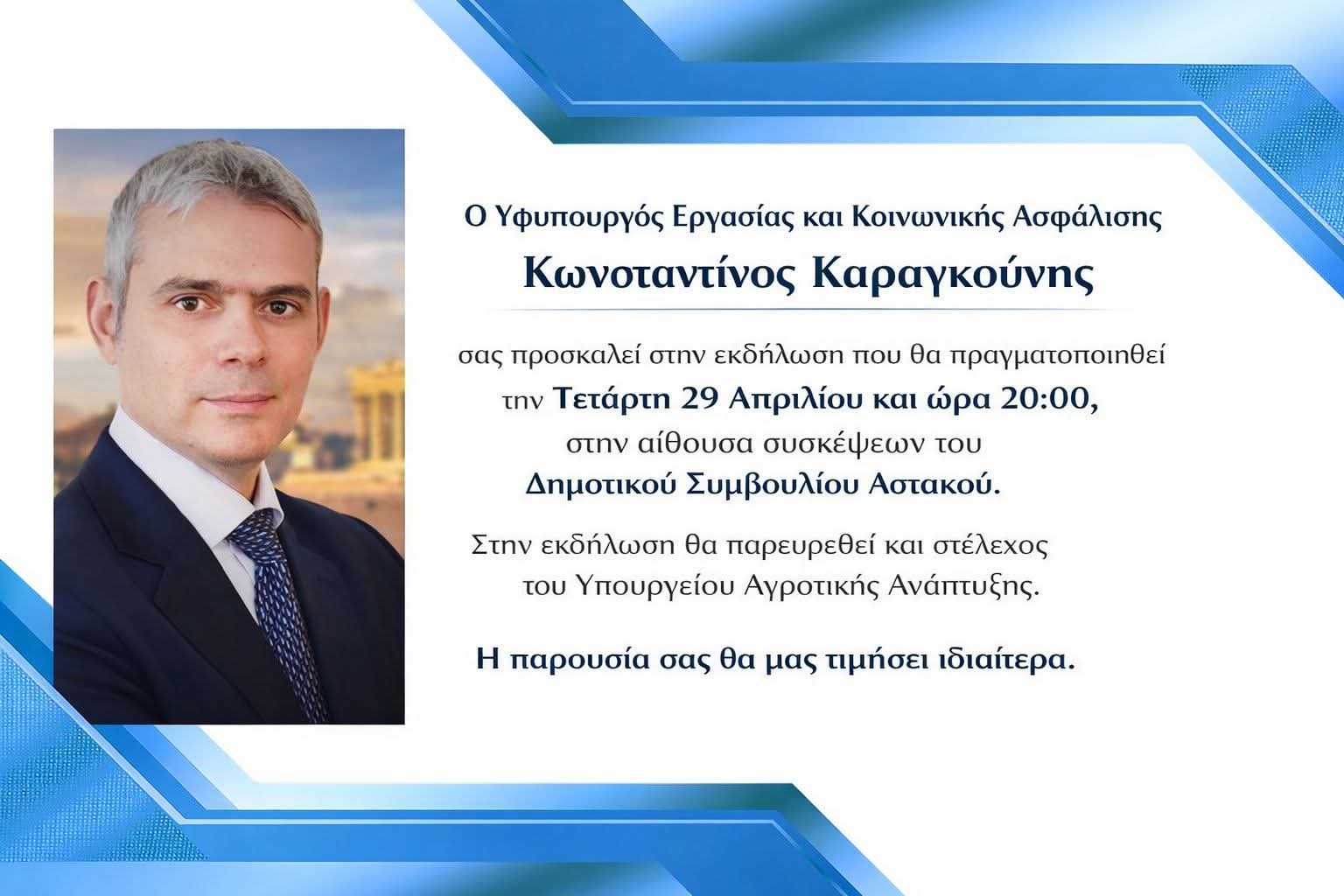 Ο υφυπουργός Εργασίας και Κοινωνικής Ασφάλισης, Κωνσταντίνος Καραγκούνης σας προσκαλεί στην εκδήλωση που θα πραγματοποιηθεί την Τετάρτη 29 Απριλίου και ώρα 20:00, στην αίθουσα συσκέψεων του Δημοτικού Συμβουλίου Αστακού.