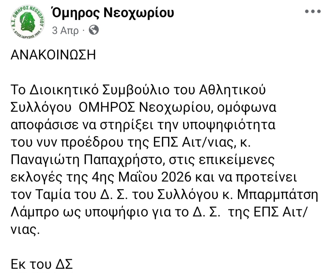 Σε μια ξαφνική ανατροπή της αρχικής απόφασης προχώρησε το Δ.Σ. του Ομήρου Νεοχωρίου που προανήγγειλε ότι θα στηρίξει  την υποψηφιότητα του Παναγιώτη Στεργίου, με ανακοίνωση λίγες μέρες πριν τις εκλογές της ΕΠΣ Αιτωλοακαρνανίας.