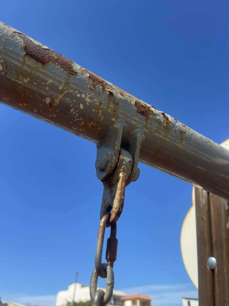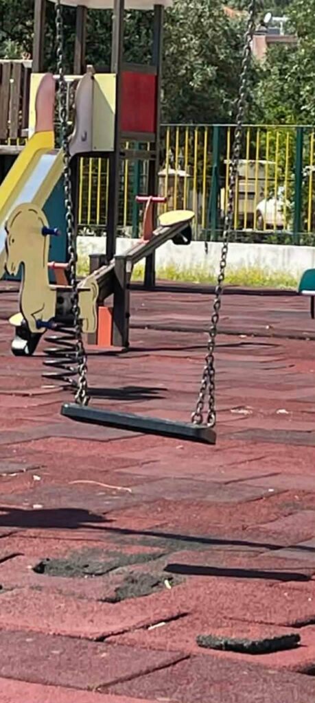 Σας αναφέρουμε σχετικά με τη συγκεκριμένη περίπτωση φθοράς που αναφέρεται και στην καταγγελία σας, ότι σε προηγούμενο έλεγχο είχε καταγραφεί εύρημα που αφορούσε φθορά επιφανειών (σκουριά) σε οριζόντιο μεταλλικό στοιχείο κούνιας, το οποίο εντάσσεται σε εργασίες συντήρησης και αποκατάστασης. Στη συνέχεια, ο Δήμος προχώρησε σε εργασίες αποκατάστασης. Ωστόσο, όπως προκύπτει και από τις πρόσφατες φωτογραφίες, το φαινόμενο επανεμφανίστηκε, γεγονός που σχετίζεται με τη φυσική φθορά των μεταλλικών στοιχείων λόγω χρήσης και έκθεσης σε εξωτερικές συνθήκες. Ο Δήμος έχει ήδη προγραμματίσει την εκ νέου αποκατάσταση του συγκεκριμένου στοιχείου, στο πλαίσιο της τακτικής και συνεχούς συντήρησης του εξοπλισμού.