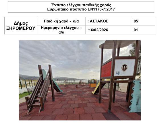 “Η παιδική χαρά της Δημοτικής Κοινότητας Αστακού διαθέτει πιστοποιητικό καταλληλότητας σε ισχύ έως τον Ιούνιο του 2026, καθώς και το προβλεπόμενο Ειδικό Σήμα Καταλληλότητας από το Υπουργείο Εσωτερικών, σύμφωνα με το ισχύον θεσμικό πλαίσιο” αναφέρει στην ανακοίνωσή του ο Δήμος Ξηρομέρου.