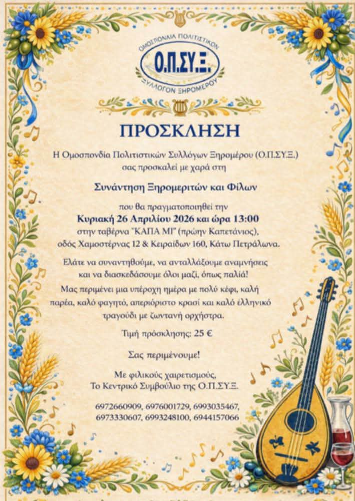 Η Ομοσπονδία Πολιτιστικών Συλλόγων Ξηρομέρου (Ο.Π.Σ.Υ.Ξ.) διοργανώνει τη Συνάντηση Ξηρομεριτών και Φίλων που θα πραγματοποιηθεί την Κυριακή 26 Απριλίου 2026 και ώρα 13:00 στην ταβέρνα “ΚΑΠΑ ΜΙ” (πρώην Καπετάνιος), οδός Χαμοστέρνας 12 & Κειριαδών 160, Κάτω Πετράλωνα.